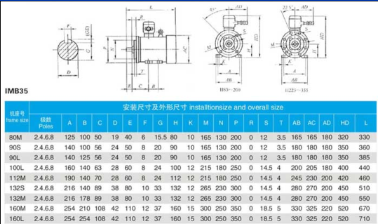 B35的安裝參數(shù)是有兩個(gè)端蓋式軸承,有底腳,傳動(dòng)端端蓋上凸緣,凸緣上有通孔,有軸伸,借助底腳安裝并附用凸緣安裝。