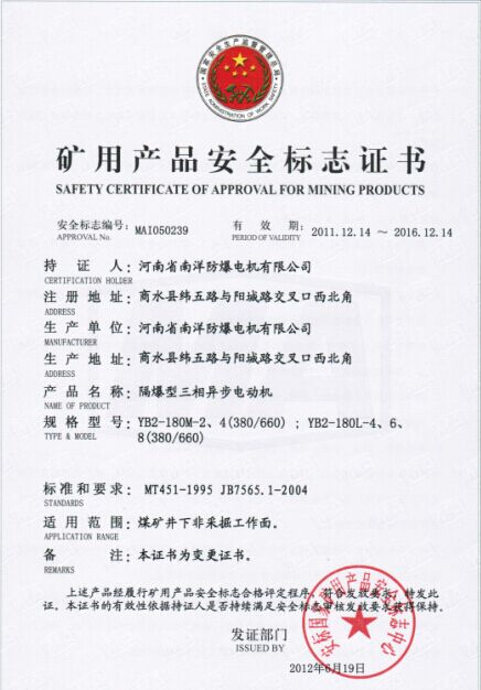 下面是YB2-180L-4-22KW防爆電機的防爆合格證和煤安證,有了這兩種證明,就可以證明YB2防爆電機繼續(xù)可以為煤礦服務了。